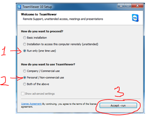 TeamViewer is free software that can be used to collaborate with other people. It enables you to connect to a computer remotely or allow someone to connect to your computer remotely. You can install it and leave it on your computer for future use (Basic Installation), install it only to access your computer remotely, or install it for one time use (Run only (one time use)). The following instructions will show you how to install it for one time use.