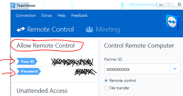 3. Once the application is installed you will see the Remote Control window. Under “Allow Remote Control” you will see an ID and Password as in the picture below. This is the ID and password that you can give someone else who also has TeamViewer, so they can access your computer.