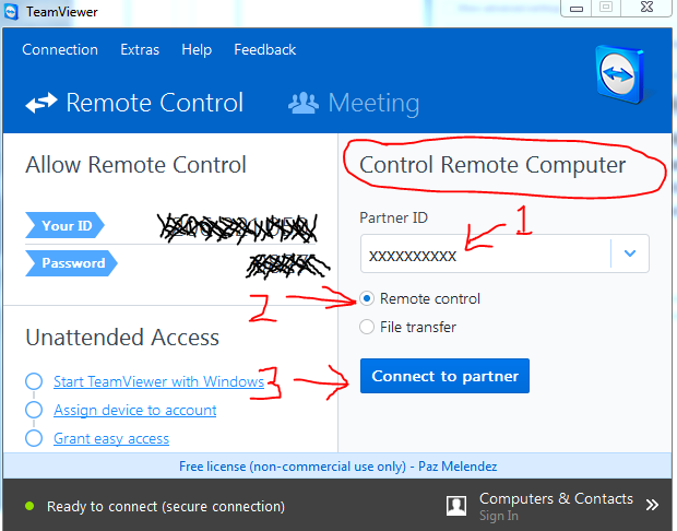 4. If you want to access someone else's computer, your partner would have to install TeamViewer, then on your computer go to the Control Remote Computer side of the screen, and enter your partner’s ID. Be sure to choose the “Remote Control” radio button, then click the button “Connect to partner”. You will be prompted for your partner’s password. Once you enter it you will be connected to their computer.