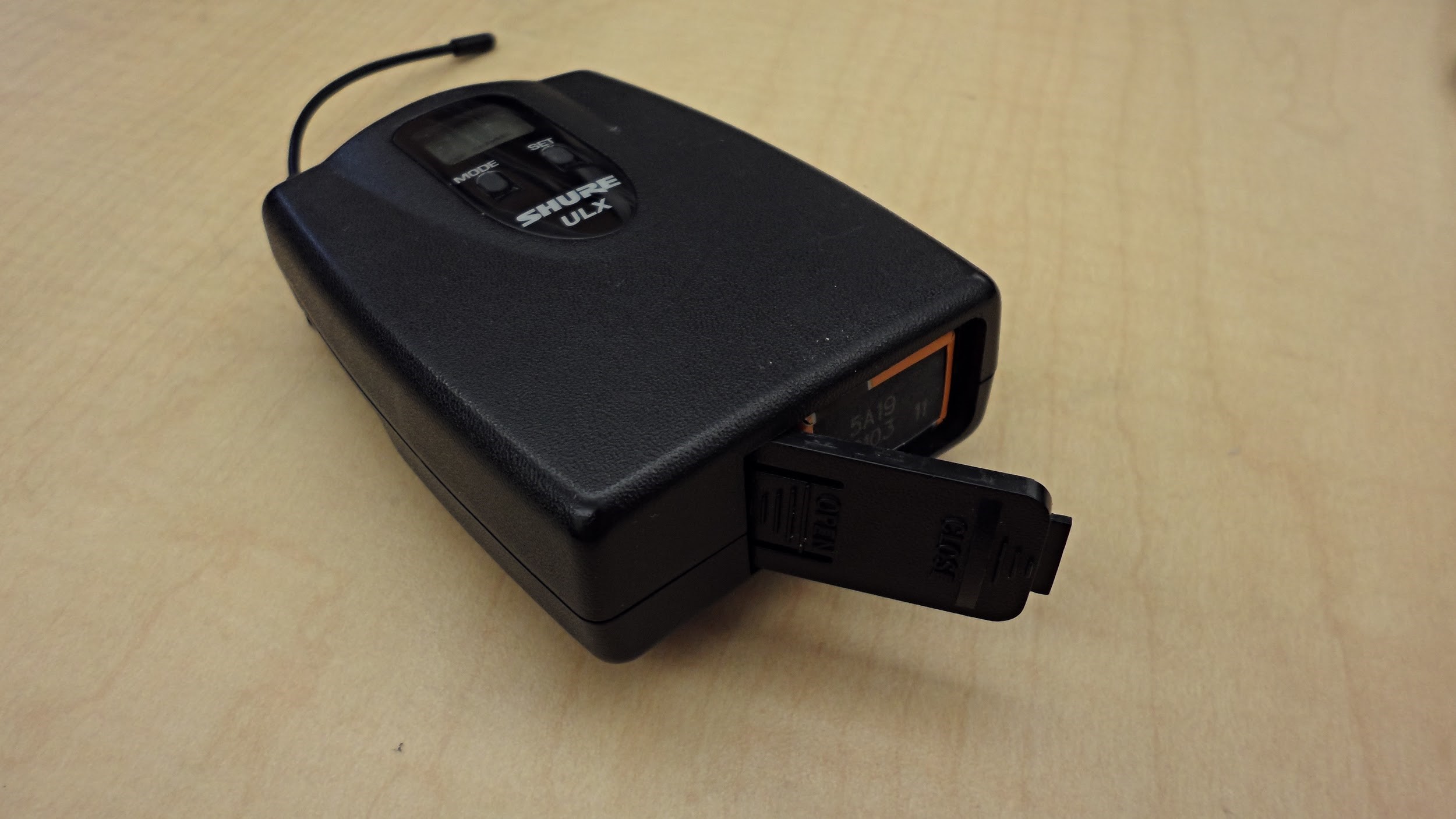 Turn the body pack upside down. Press thumb on the latch that says open. Remove battery and replace with a fresh 9V battery. Make sure the battery is placed in correctly. |