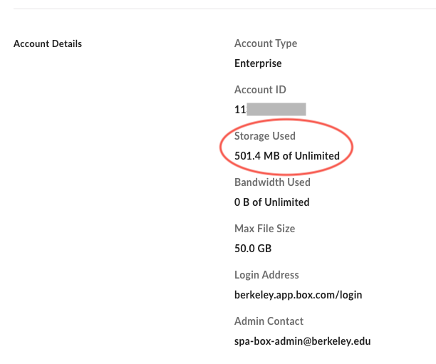 To see the usage in your Box account, go to https://berkeley.app.box.com/account(link is external), then scroll down to "Account Details" and look for "Storage Used".