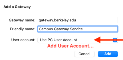 - In the "Add a Gateway" pop-up window, enter the Gateway name as "gateway.berkeley.edu" and the Friendly name as "Campus Gateway Service." In the "User Account" field, select "Add User Account..."