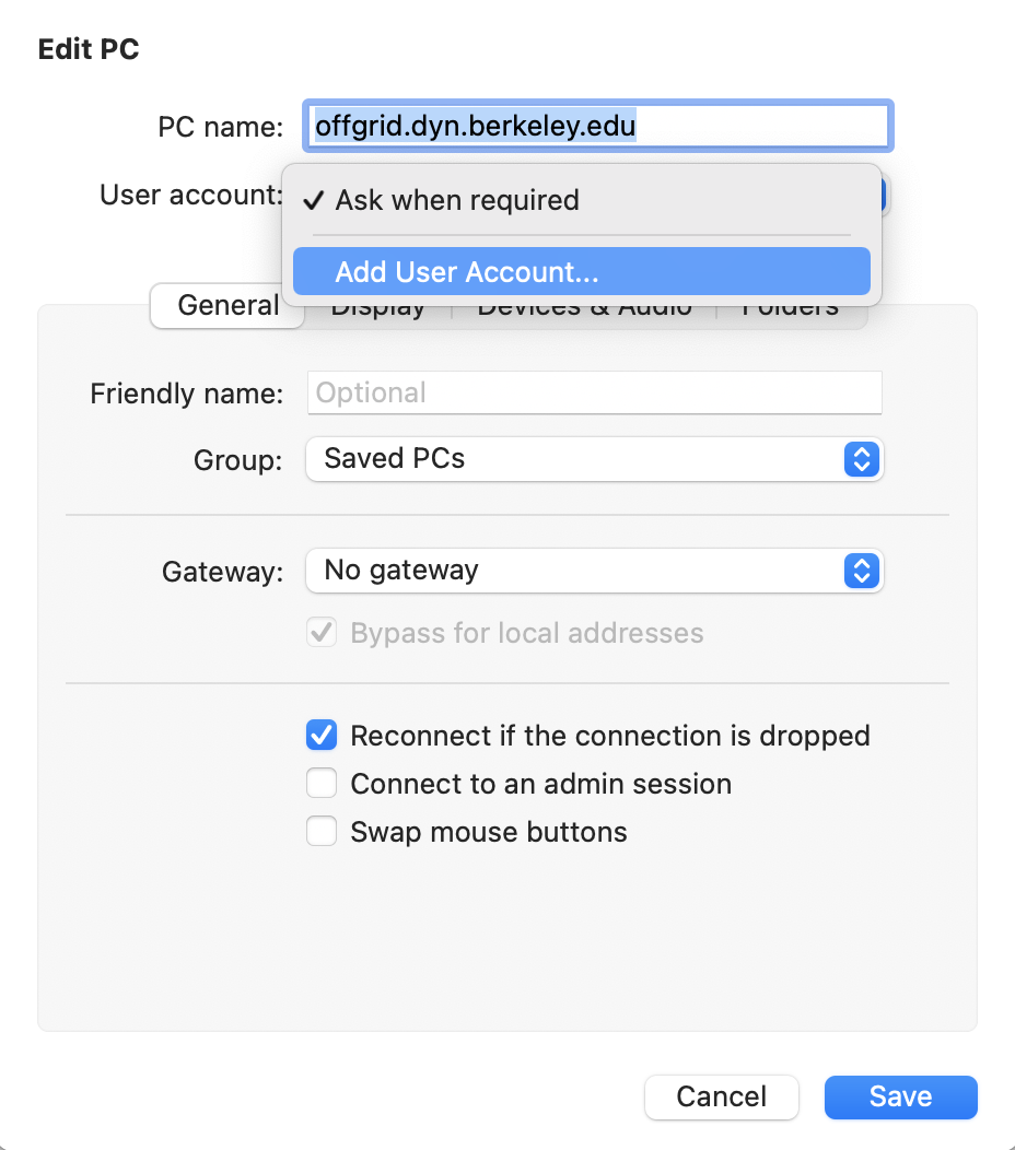 - Right-click a PC icon and click “Edit”. Then click the "User account" dropdown and select “Add User Account.”