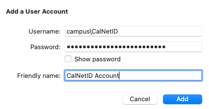 - In the "Add a User Account" pop-up window, enter the user's CalNetID in the "Username" field as "campus\CalNetID" and ask them to enter their CalNet passphrase. Enter and easily recognizable "Friendly name."