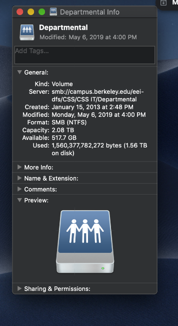 Find the shared drive(s) icons(s).  Highlight it and click File - Get Info or click Command - I.