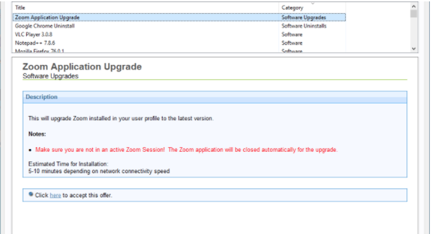 3. Read the Offer’s description and be sure to end any active Zoom meetings at this time. The upgrade will restart Zoom, which will automatically close all Zoom sessions.