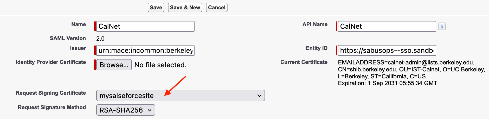 When integrating Salesforce with single sign-on (SSO) a typical use-case is to use the SAML protocol. By default, Salesforce generates the SAML service provider metadata using a certificate that expires in 1 year. CalNet will ask that you instead configure a 10 year self-signed certificate.