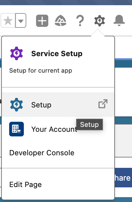 1. Within the Service Console, click on the gear icon at the top right and select Setup.