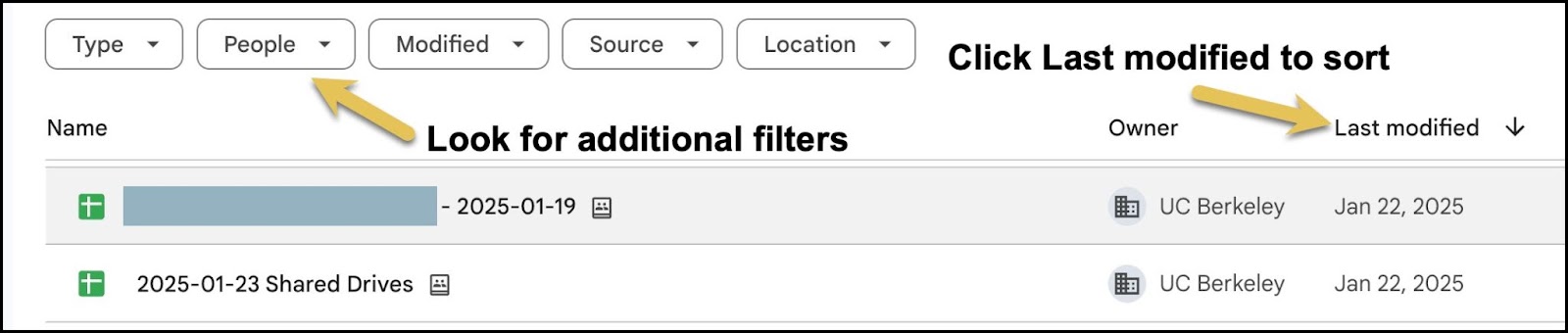 You can also sort your drive files using the Last Modified drop-down. Look for other options under the search bar where you can quickly filter by who owns the files or the type of file.