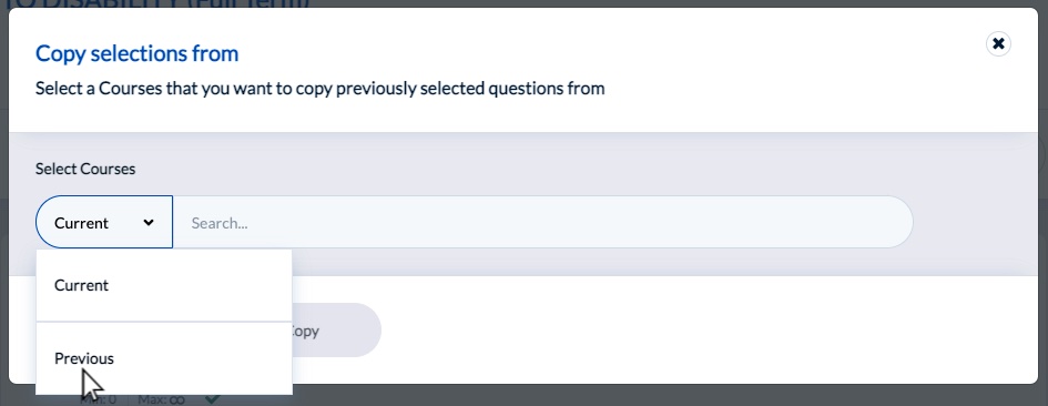 - You will have the option to copy questions from current or previous semester evaluations. Select "Previous", open the search box, and choose from the list of your previous evaluations.