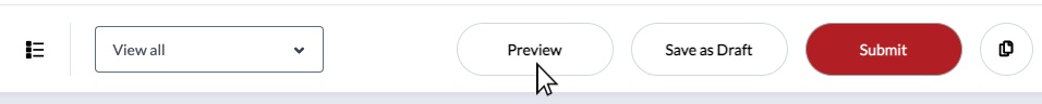 - From the top menu, click "Preview." Make sure "View all" is selected from the drop down menu to the left so all questions are included in the preview.