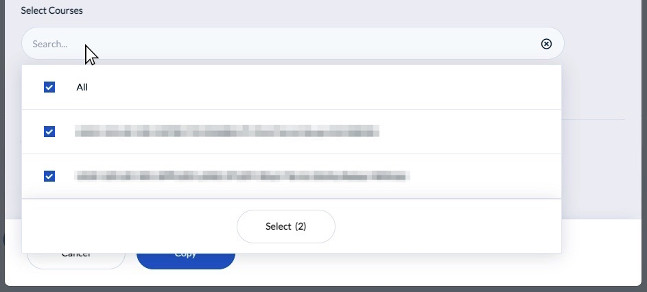 - Click on the "Search" box and select which evaluations you want to copy your questions to then Click the "Select" button.