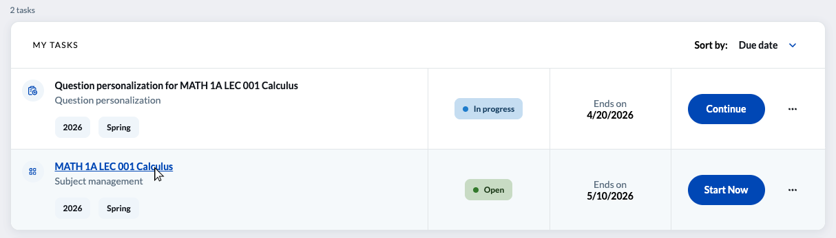 2. Under Tasks, click on the "Subject management" task for the course you want to view the response rate for. You can do this for each course being evaluated.