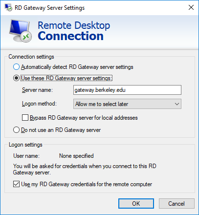 RDP client is now configured to use the gateway for connections to server names entered in the computer field.