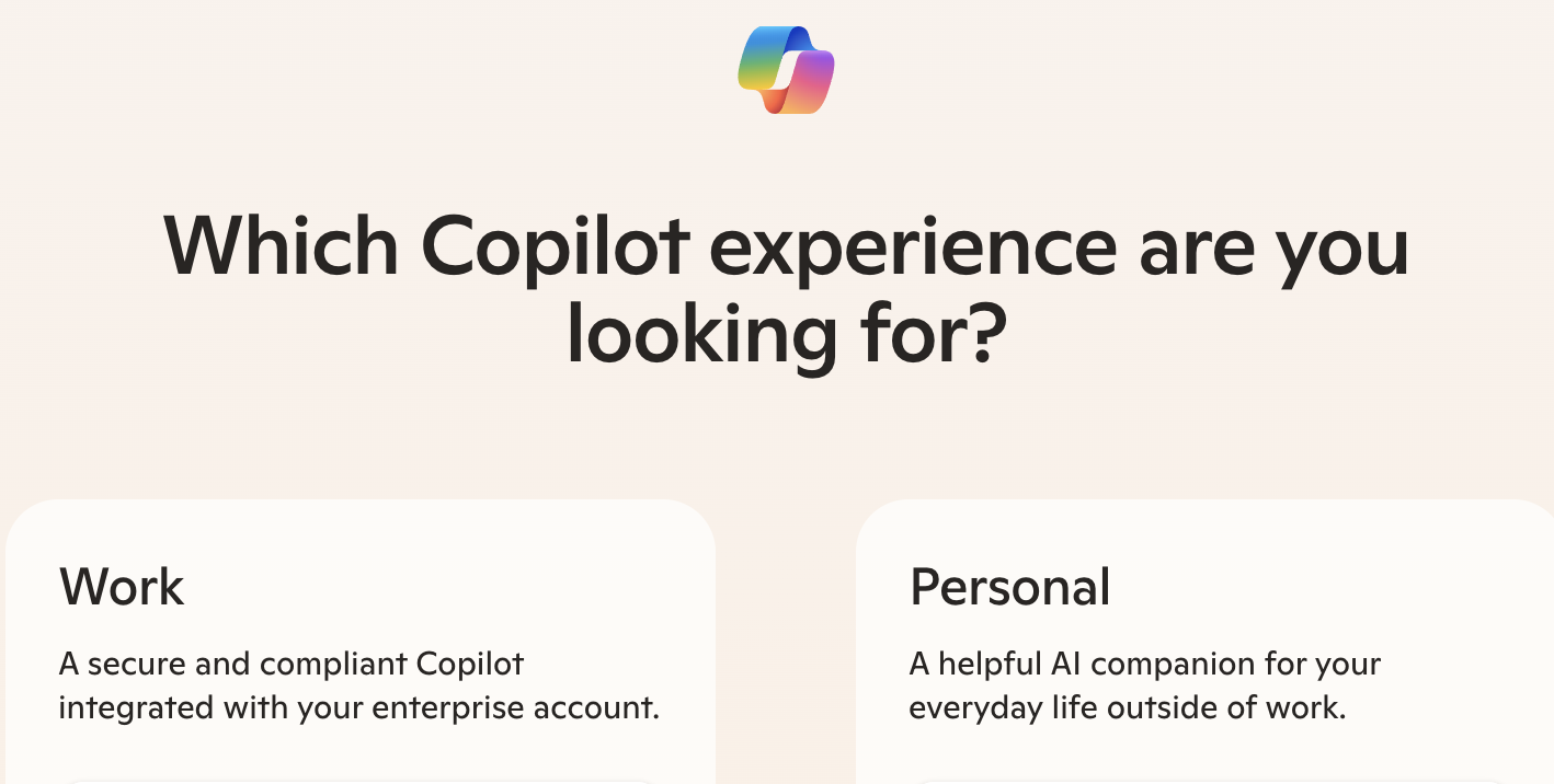 You will then be prompted to choose between the Work and Personal Copilot experience. Choose the Work option.